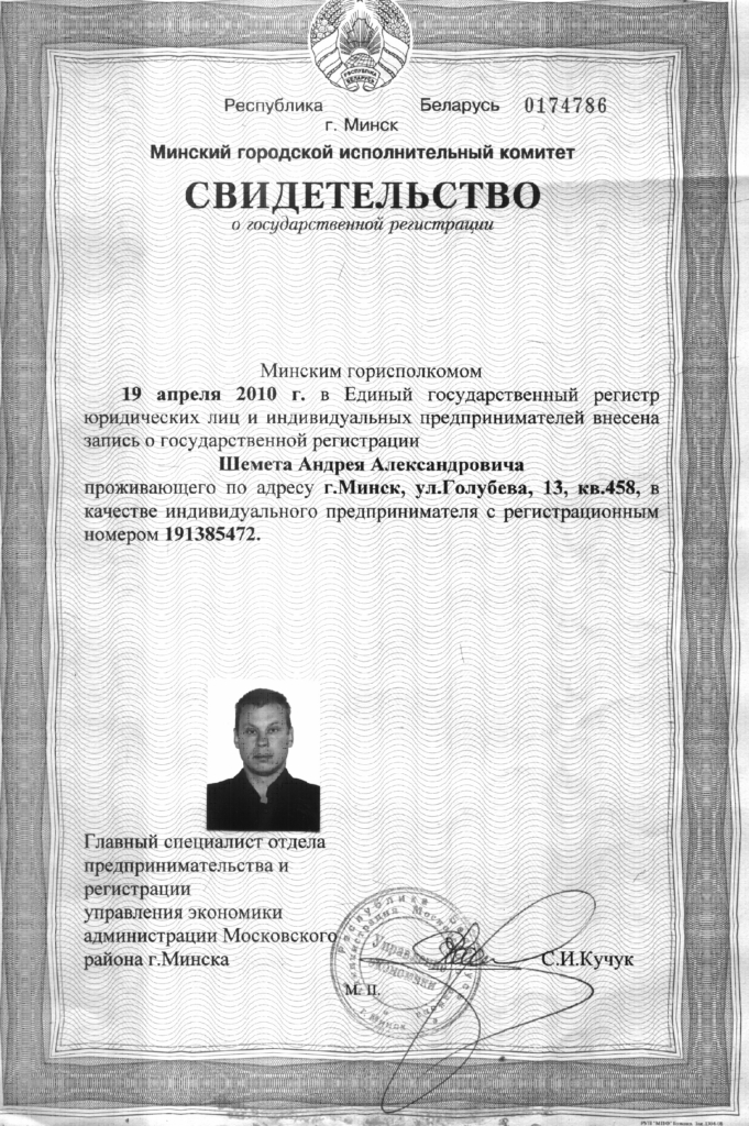 - Свидетельство о гос. регистрации № 0174786 выдано 19.04.2010 Минским горисполкомом