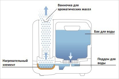 Паровой увлажнитель можно использовать в качестве ингалятора, а если добавить в резервуар с водой пару капель эфирного масла, он ароматизирует воздух.